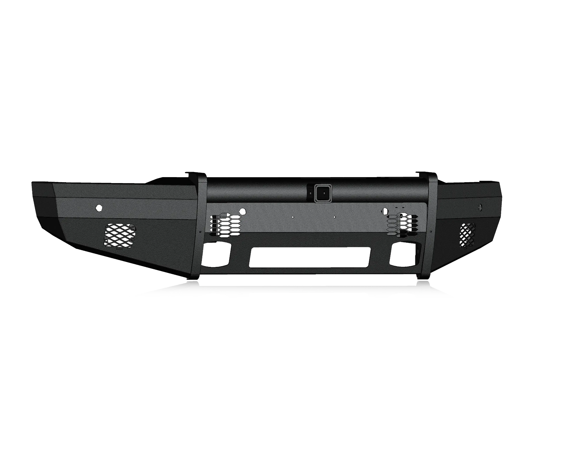 Made in America and Proudly Built in Texas | 11-Gauge Steel | 1/4-inch Mounting Brackets and Internal Bracketry | Schedule 40 Pipe | Direct Bolt-On Design | Factory Fog Light Compatible | Sensor Capable | Integrated Adaptive Cruise Control | 2-inch Receiver Hitch | Textured Satin Black Powder Coat | Lifetime Structural Warranty